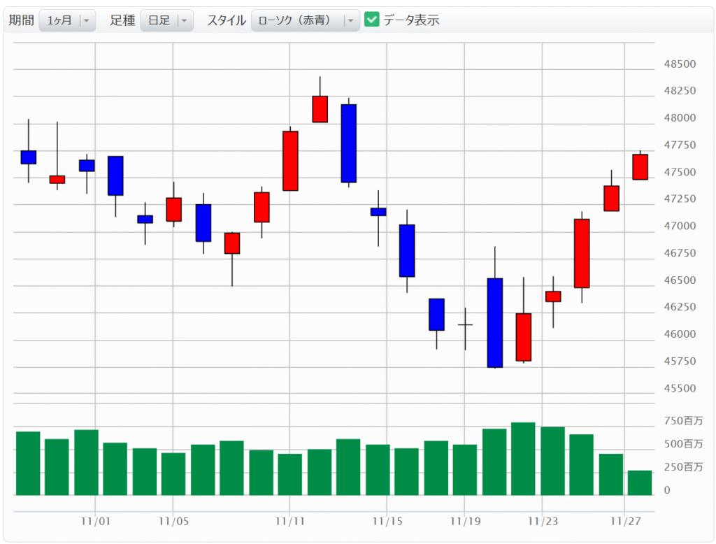 最初に相場のチェックです。私のポートフォリオは日本株が多いので日経平均株価やTOPIXに連動しがちです。