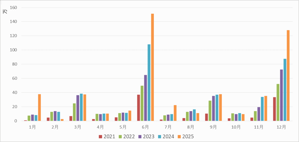 11月も強かったのに12月も普通に強かったですね。グラフを見てわかるように2025年は6月からずっと上がり続けていました。