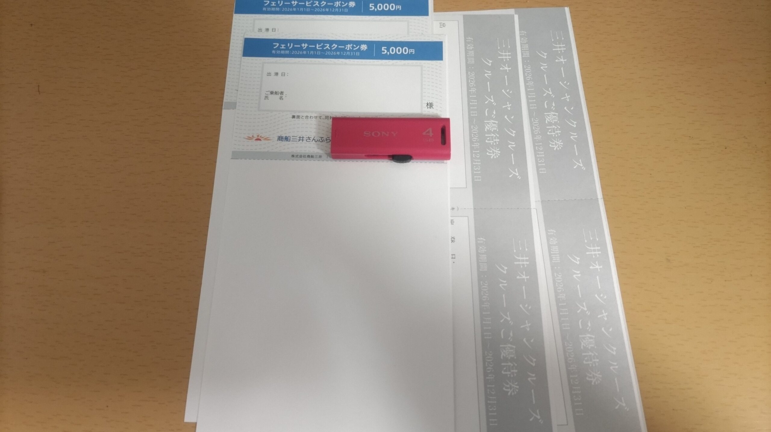 商船三井からさんふらわあフェリーのクーポン券です。ここの優待は珍しく株主以外の利用を公式が認めています。去年は姉夫婦に譲りました。3月の権利ではカタログギフトがいただけるので、そっちの方が楽しみです。