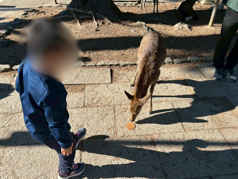 子どももたくさんの鹿に喜んでいましたが、下の子は鹿せんべいを持っているときに鹿に囲まれて、鹿せんべいを全部放り投げて泣いてしまいました(笑)
