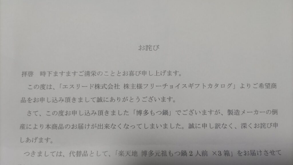 エスリードさんから優待が到着しましたが、お詫びが一緒についてきました。