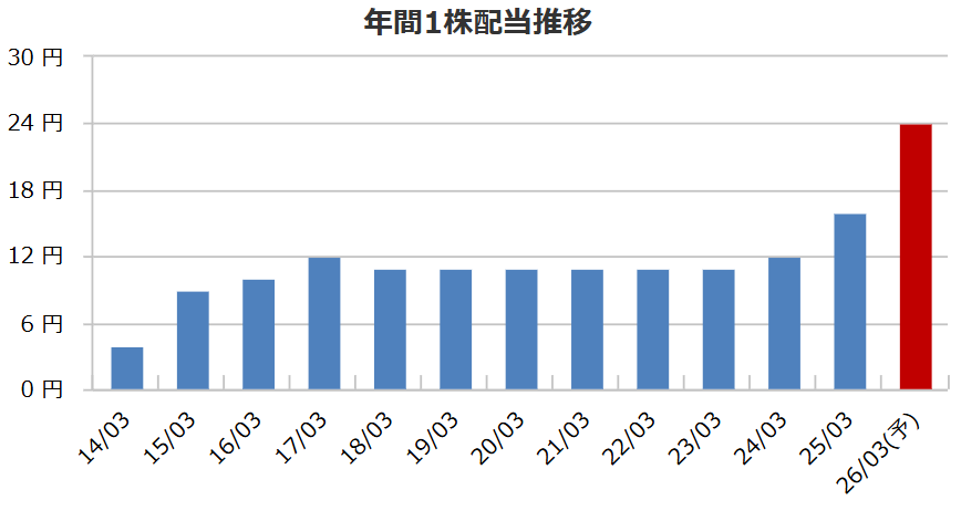 これから配当性向もあげていくみたいですね。ということは、今期の業績も良さそうなのでこのままいくと26年3月期に増配がありそうです。