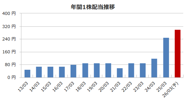 還元方針が変わったので配当の伸びが凄いことになっていますね。利回りが高く放置されています。