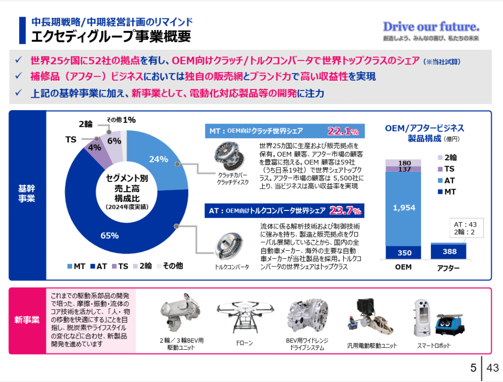 駆動系自動車部品メーカー。自動変速装置/AT(トルクコンバータ、トランスミッション部品、ダンパー)、手動変速装置/MT(クラッチディスク、クラッチカバー) 、二輪車用クラッチの製造・販売。マニュアルクラッチは国内トップ、トルクコンバータ(AT車用)は世界トップクラス。国内の全自動車メーカー・海外の主要自動車メーカー(フォード・GM・他)に製品を供給。EV用製品はワイドレンジドライブシステム、インホイールモータ、小型車用e-Axilを開発。